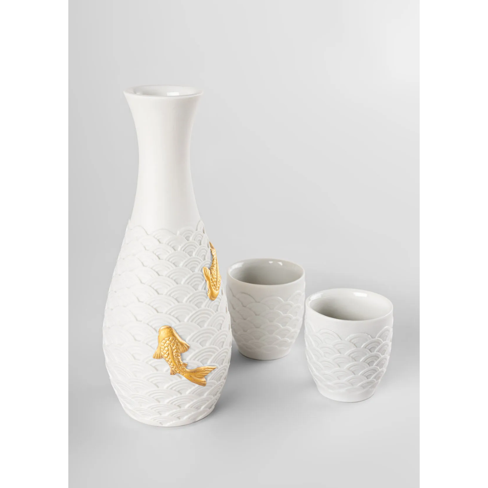Koi sake set A bottle and two cups in white porcelain in a set for serving sake.