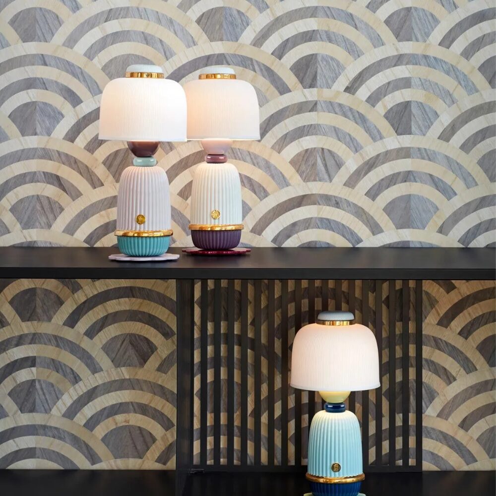 Traditional simple Japanese dolls are reinterpreted in this version of cordless lamps. Originally from the region of Tohoku, in the north of Japan, today these traditional dolls have replaced carved wood for handcrafted porcelain to become functional, decorative lighting. Made in glazed porcelain decorated in a combination of pastel tones, colored vanishes and details in golden luster. The shade is in translucent matte white porcelain and the lamps come with a tactile metal dimmer switch etched with the brand’s signature flower logo to regulate the intensity of the light.