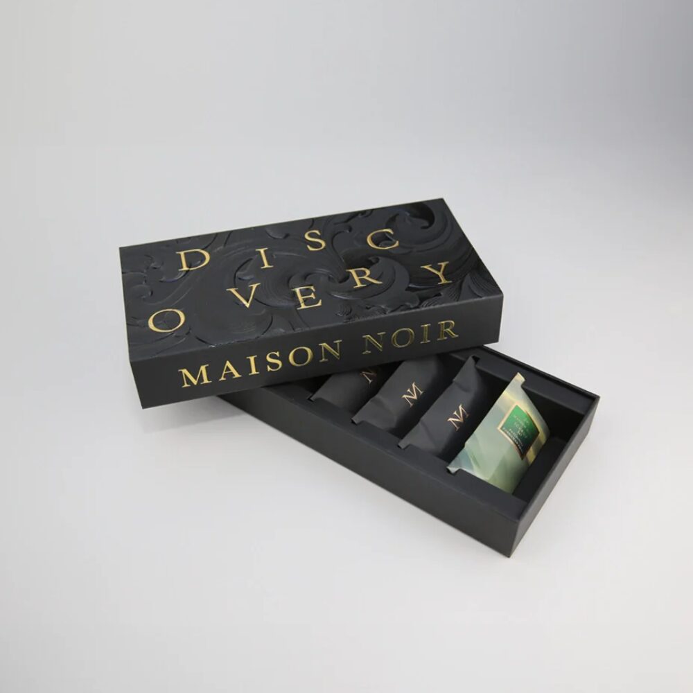Luxury Discovery Set. The Maison Noir Luxury Discovery Set is the perfect way to open all our doors and dive deep into our fragrance worlds. The set contains Vertigo 236 | Volantis 685 | Bohemia 265 | Alter Ego 786 | Somnia 517 | Icarus 347 and comes in a luxurious and giftable box. We do also add a single vial of Quandoley 805 into the shipment box.